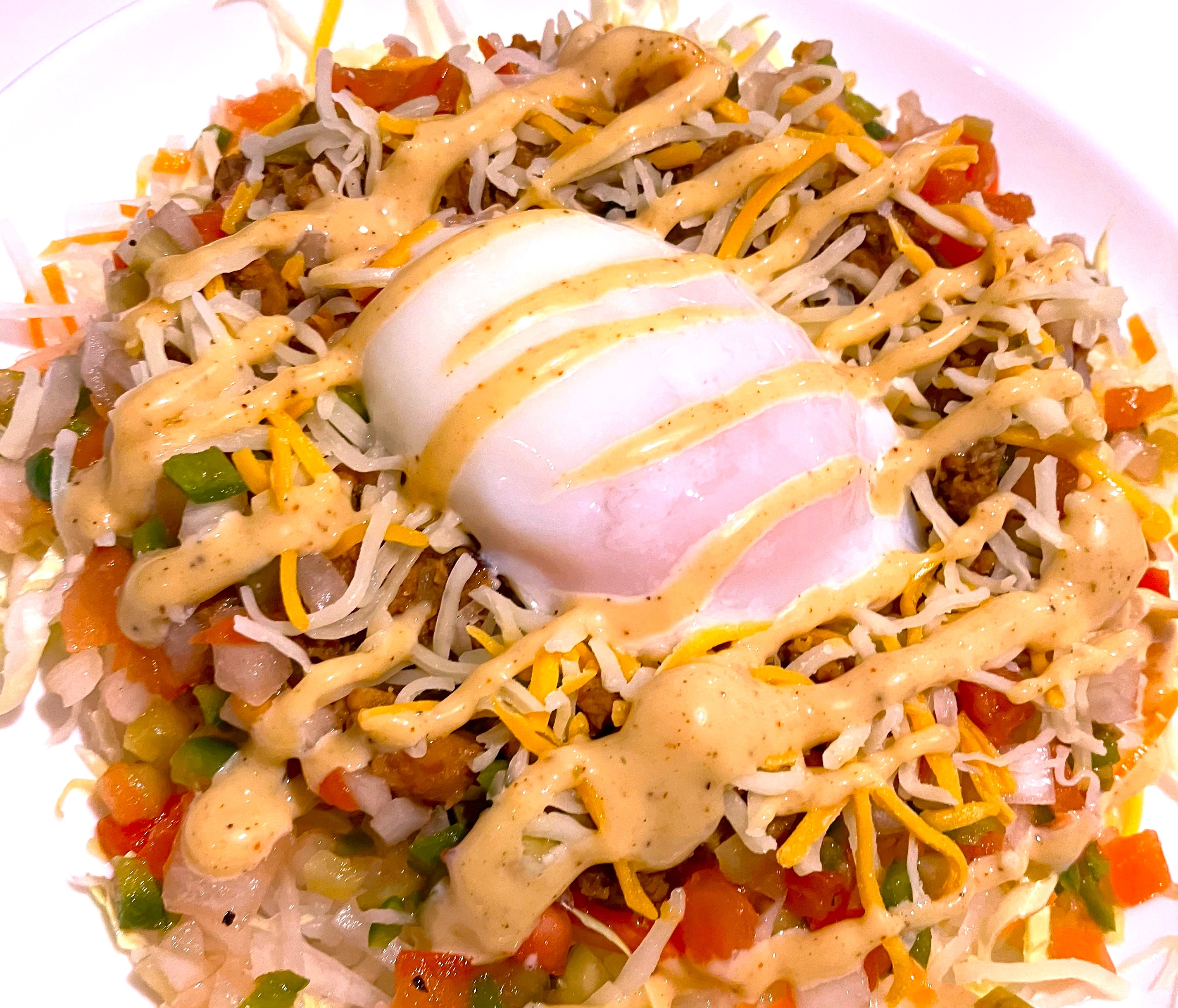 トッピングにはアボカドとトマトにミックスナッツの香ばしさと程よい食感をプラスした完全オリジナルのワカモレと香りがバツグンにいいハーブフランク、定番化している酸味を抑えた自家製サワークリームがタコライスを引き立てます。