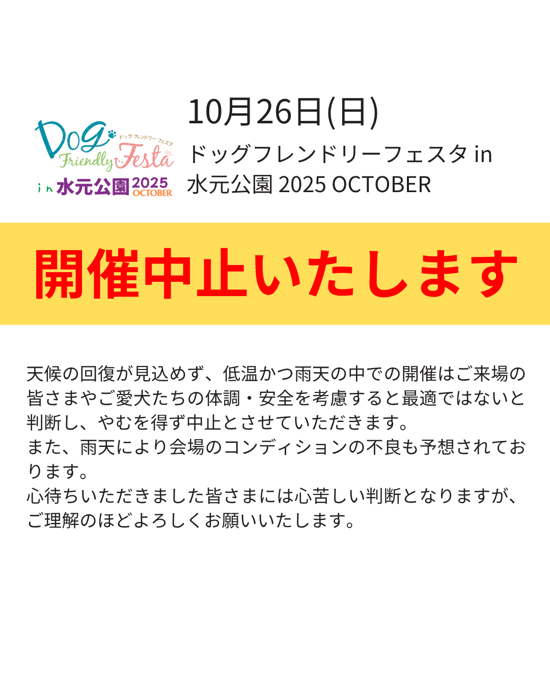 大変残念なお知らせですが、明日10月26日(日)のドッグフレンドリーフェスタ in 水元公園 2025 OCTOBER Day2は天候の回復が見込めず、強風かつ雨天の中での開催はご来場の皆様や愛犬たちにとって最適ではないと判断し、やむを得ず中止とさせていただきます。