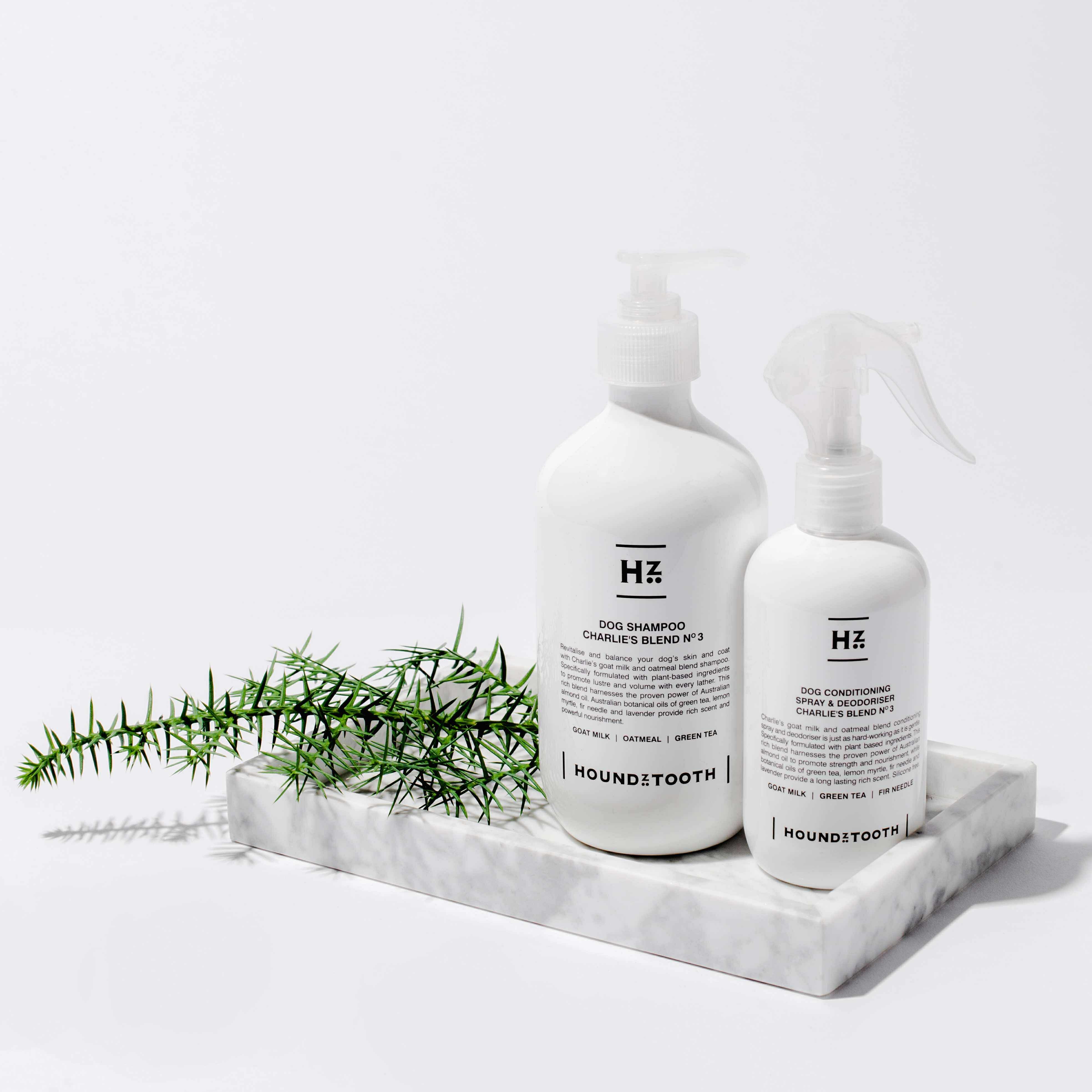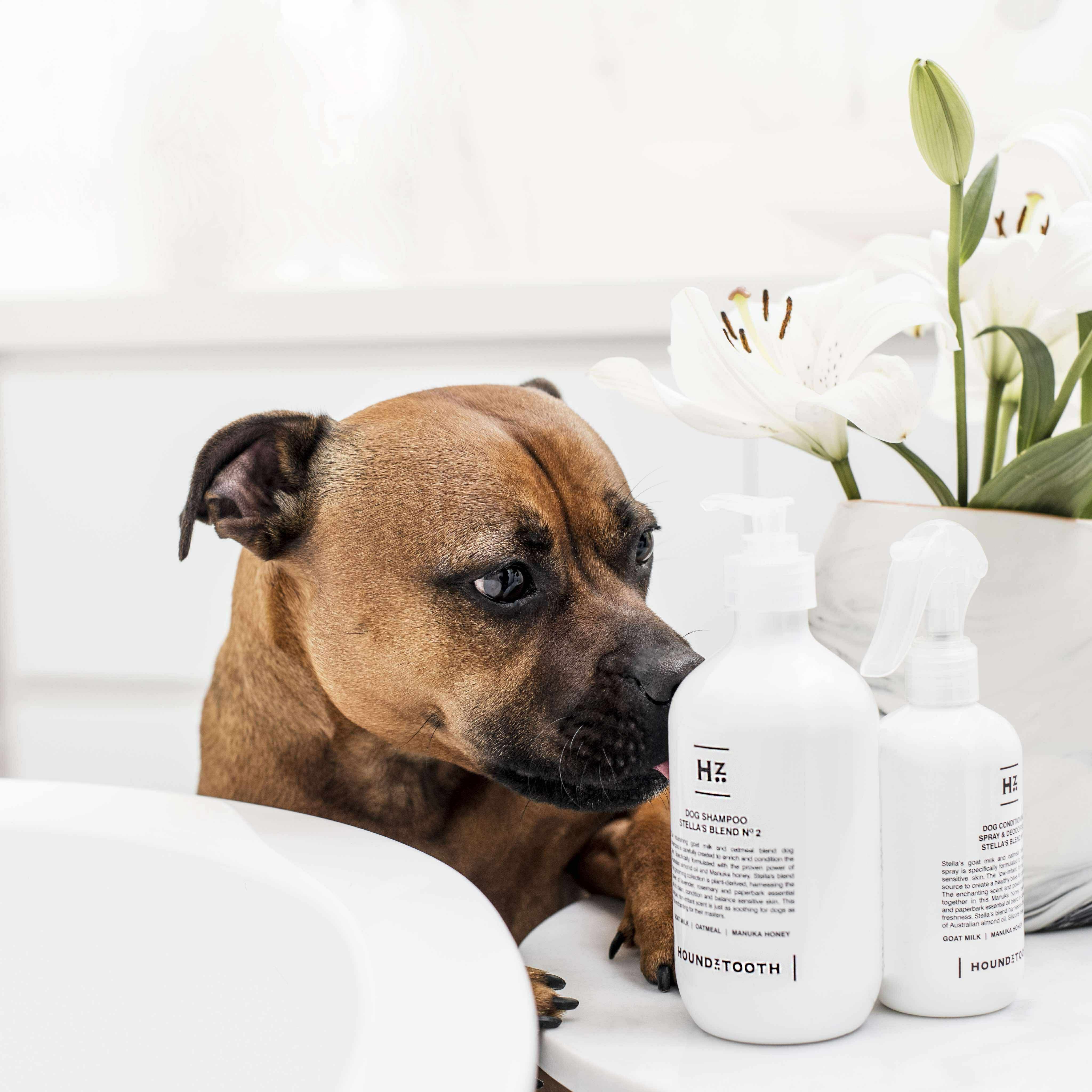 <日本初上陸!「ハウンズトゥース」> オーストラリアから上陸した**ヤギミルク配合ペットシャンプー「ハウンズトゥース」**を先行紹介!プロも絶賛するほどの保湿力で、敏感肌や乾燥肌のワンちゃんにも最適です。今回はプードル用シャンプーとスプレーを先行発売。お試しサンプルもご用意しています!